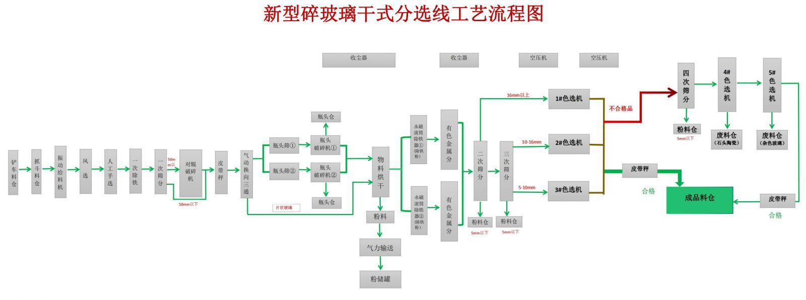 為推動再生資源綜合利用,充分改進(jìn)碎玻璃分選新工藝,詳見工藝流程圖: